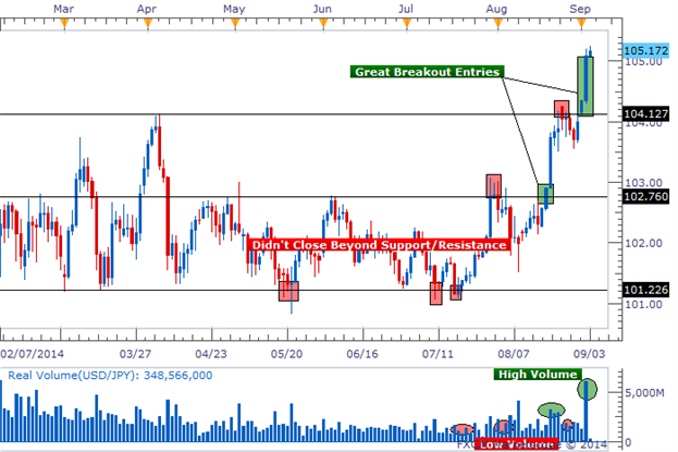 상승 경향에 있을 때나, 횡방향의 시장에서는, 주가가 저항선에 이르는 일이 있습니다.이 점에서는, 매도 압력이 매수 압력에 이겨, 상승 경향이 엷어지기 시작합니다. 주가가 그 레벨을 돌파했을 때, 거래 총액은 많거나 평균 이상의 경우, 그 브레이크 아웃은 보다 중요하다라고 일반적으로 생각되고 있습니다. 음량의 저하를 수반하는 브레이크 아웃은, 이 움직임에 대한 열의가 결여되어 있을 가능성이 있는 것을 시사하고 있습니다.
